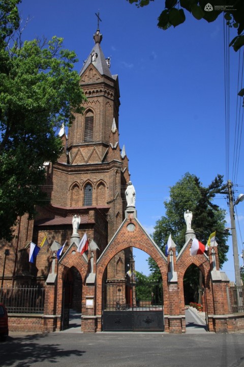 Pierwotny kościół pw. św. Katarzyny wzmiankowany został w 1607 r., natomiast parafię erygowano w 1872 roku. Obecny, neogotycki kościół pw. św. św. Apostołów Piotra i Pawła zbudowany został w latach 1882-1888 wg proj. arch. Józefa Chrzanowskiego na miejscu poprzedniej, drewnianej świątyni wzniesionej w 1787 roku. Konsekrowany został 10 maja 1909 roku. W 1918 r. mieszkańcy wsi uczcili odzyskanie niepodległości przez Rzeczpospolitą poprzez posadzenie obok kościoła dębu zwanego Dębem Wolności. W 1934 r. zaobserwowano pierwsze pęknięcia ścian wzdłużnych kościoła. W 2 poł. XX w. wycięto otaczające kościół drzewa z powodu naruszania przez nie konstrukcji fundamentów oraz wymieniono oszklenie okien. W 2001 r. przeprowadzono remont organów. W 2002 r. wykonano dokumentację geotechniczną oraz projekt zabezpieczenia ścian kościoła przed dalszym pękaniem. W 2004 r. wymieniono cynkowe pokrycie dachu wieży na blachę miedzianą.
