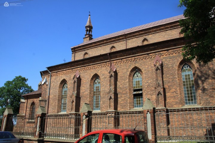 Kościół pw. św. św. Apostołów Piotra i Pawła umiejscowiony jest w pd. części miejscowości. Jest świątynią neogotycką, murowaną z cegły, nieorientowaną Fasadą skierowany jest w kierunku pn. wsch., a prezbiterium na pd. zachód. Do trójnawowego korpusu przylega od pn. wysoka wieża, natomiast od pd. węższe, czworobocznie zamknięte prezbiterium. Od wsch. do prezbiterium dobudowana została na planie kwadratu otwarta na wsch. nawę boczną kaplica, a od zach. — analogiczna zakrystia. Wieża w przyziemiu mieści kruchtę, prowadzącą do nawy głównej. Od wsch. przylega do niej druga, boczna kruchta, prowadząca bezpośrednio do wsch. nawy bocznej. Po drugiej, zach. stronie do wieży przylega kaplica otwierająca się na zach. nawę boczną. Nad dwuspadowym dachem, kryjącym kościół, wznosi się wieżyczka na sygnaturkę. Ściany kościoła opięte są szkarpami. We wnętrzu znajduje się m. in. przeniesiony z dawnego kościoła barokowo-klasycystyczny ołtarz boczny z przełomu XVIII i XIX wieku. Chór muzyczny wsparty jest na czterech filarach. Kościół otoczony jest przez ozdobne murowano-metalowe, kute ogrodzenie z neogotycką bramą główną flankowaną dwiema ostrołukowo sklepionymi furtkami.